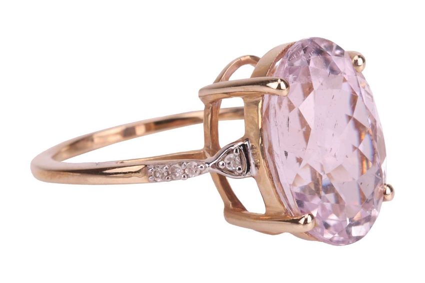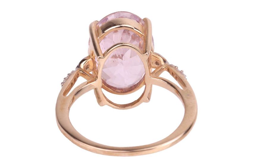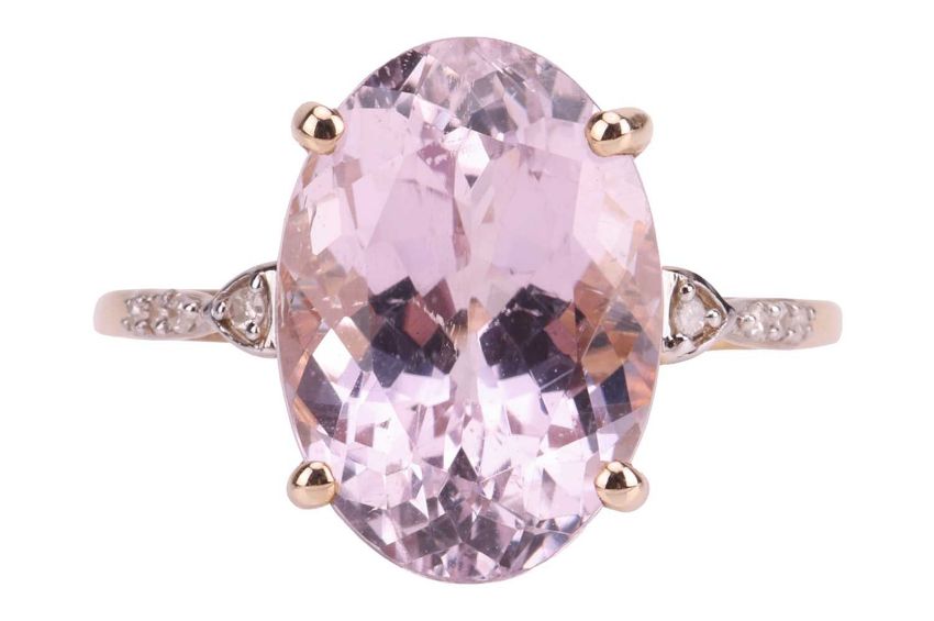 A kunzite solitaire ring in 9ct yellow gold, claw-set with an oval-cut kunzite of 14.0 x 9.8 x 7.5 mm, in pale purplish-pink colour, between diamond-set shoulders, British assay marks, size L½, 3.6 grams.