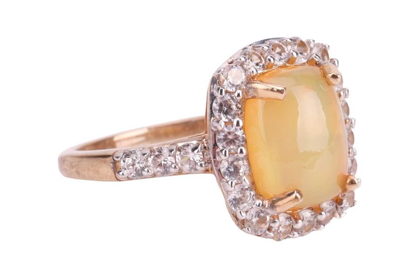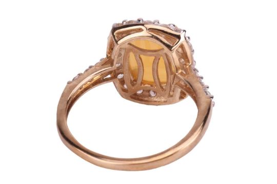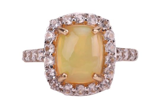 An opal and diamond cluster ring, the cushion-shaped cabochon opal, weighing approximately 1.58cts, within a brilliant-cut diamond surround and similarly-cut and set diamond shoulders, approximately 0.70ct total, some diamonds testing as possible lab-grown diamonds, mounted in 9ct yellow gold, stamped with maker's mark TJC, 9K, partial UK hallmark, ring size M 1/4, gross weight 3.1 grams.