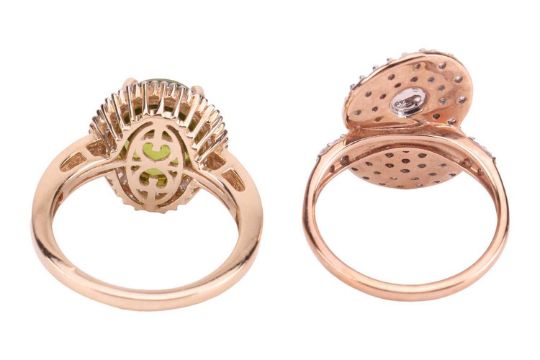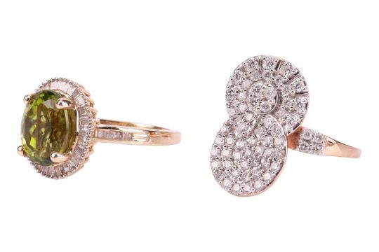 Two rings; comprising a peridot and diamond-set cluster ring, with a central oval mixed-cut peridot, surrounded by baguette-cut diamonds, in a 9ct yellow gold mount, size M1/2, together with a diamond-set circular-style panel ring, in a 9ct rose gold mount, size M; 8.3 grams (2)