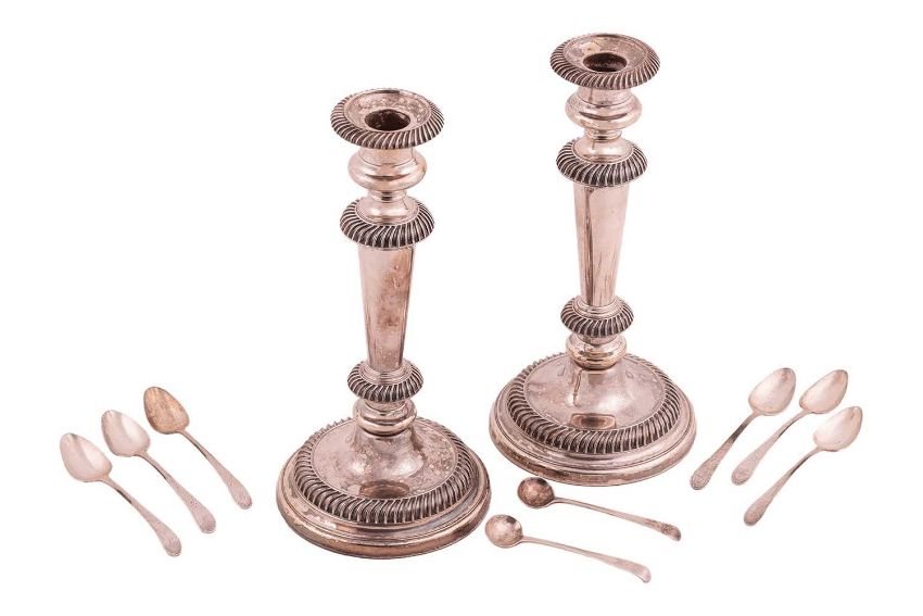 A pair of 19th century Old Sheffield Plate candlesticks, circular with tapering cylindrical stems and gadrooned borders throughout, 26cm high, together with a set of six George III bright cup teaspoons, London 1791 by Peter and Ann Bateman, and a pair of Georgian condiment spoons. Gross weight weighable 2.8ozt, 88 grams