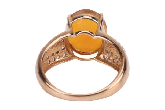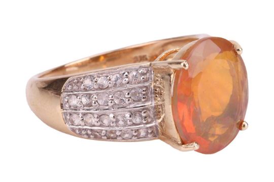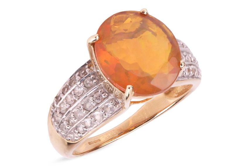 A fire opal dress ring, the oval-shaped fire opal, weighing approximately 2.36cts, the tapered shoulders claw-set with four rows of circular-cut colourless sapphires, mounted in 9ct yellow gold, stamped 375, partial Birmingham hallmark, ring size N, gross weight 3.7 grams.